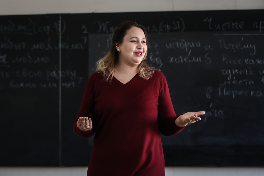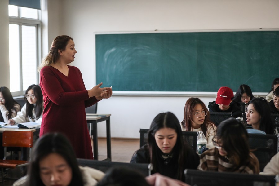 Evgenia, a Russian teacher of Shenyang University, gives a Russian class at the university in Shenyang, northeast China's Liaoning Province, Dec. 22, 2023. (Xinhua/Pan Yulong)