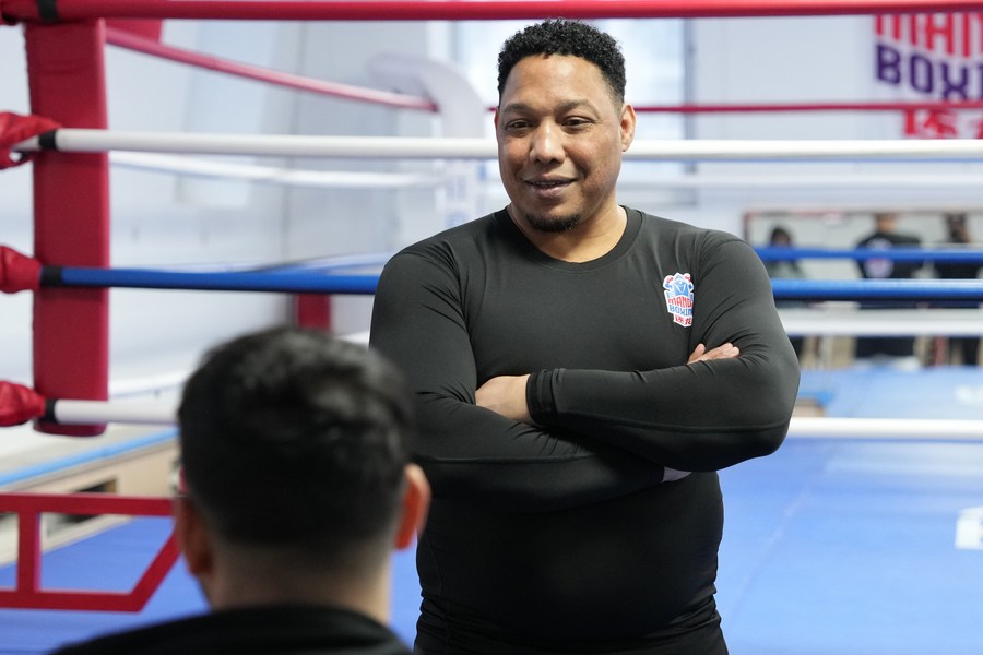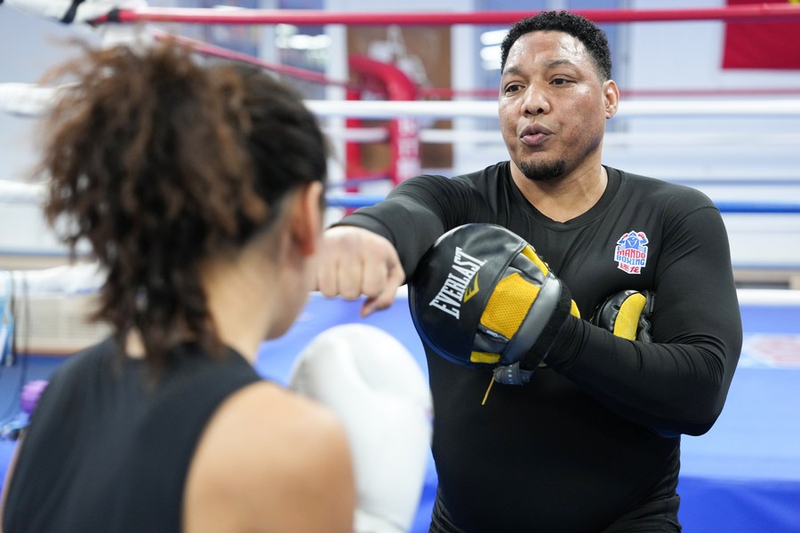 Armando, a Cuban boxing instructor, trains a student at a boxing club in Harbin, northeast China's Heilongjiang Province, Dec. 19, 2023. (Xinhua/Xie Jianfei)