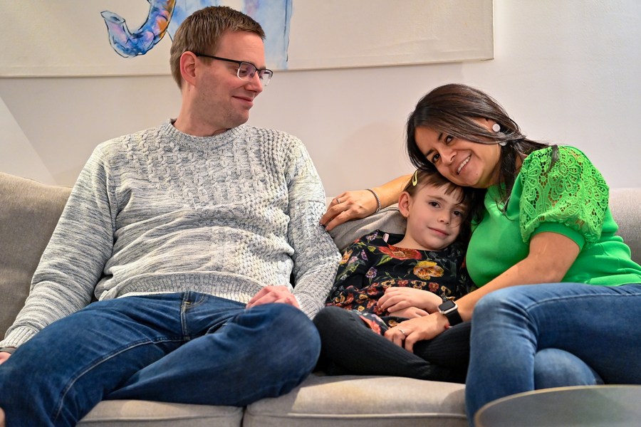 Sascha Schuerrer (L), a German engineer of Audi FAW NEV Co., Ltd., enjoys leisure with his family at home in Changchun, northeast China's Jilin Province, Nov. 24, 2023. (Xinhua/Yan Linyun)