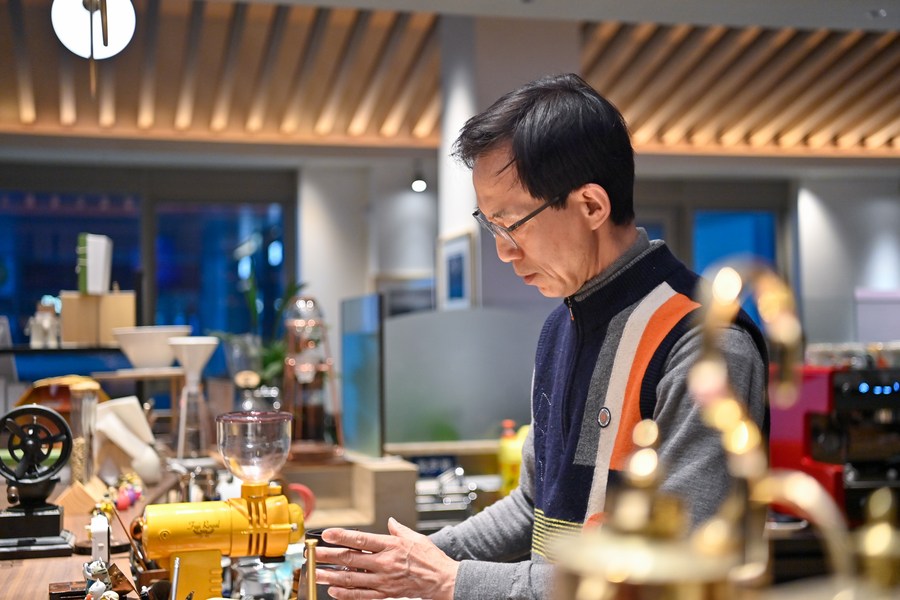 Woo Kyong-Jei, a South Korean barista, makes coffee at a cafe in Changchun, northeast China's Jilin Province, Dec. 27, 2023. (Xinhua/Yan Linyun)