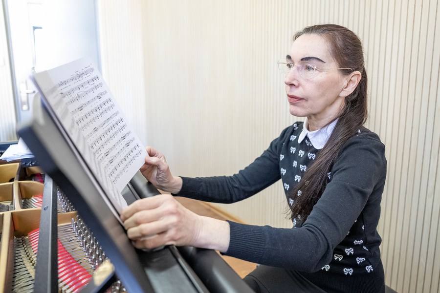Russian pianist Olga views a music score at a classroom of Harbin Conservatory of Music in Harbin, northeast China's Heilongjiang Province, Dec. 21, 2023. (Xinhua/Xie Jianfei)