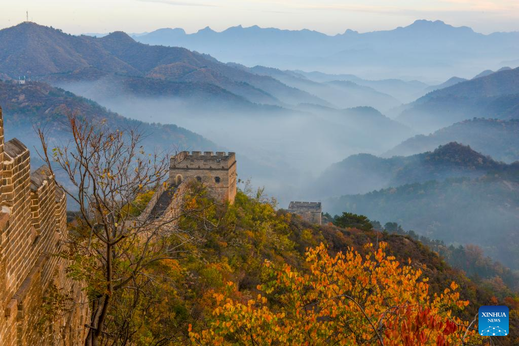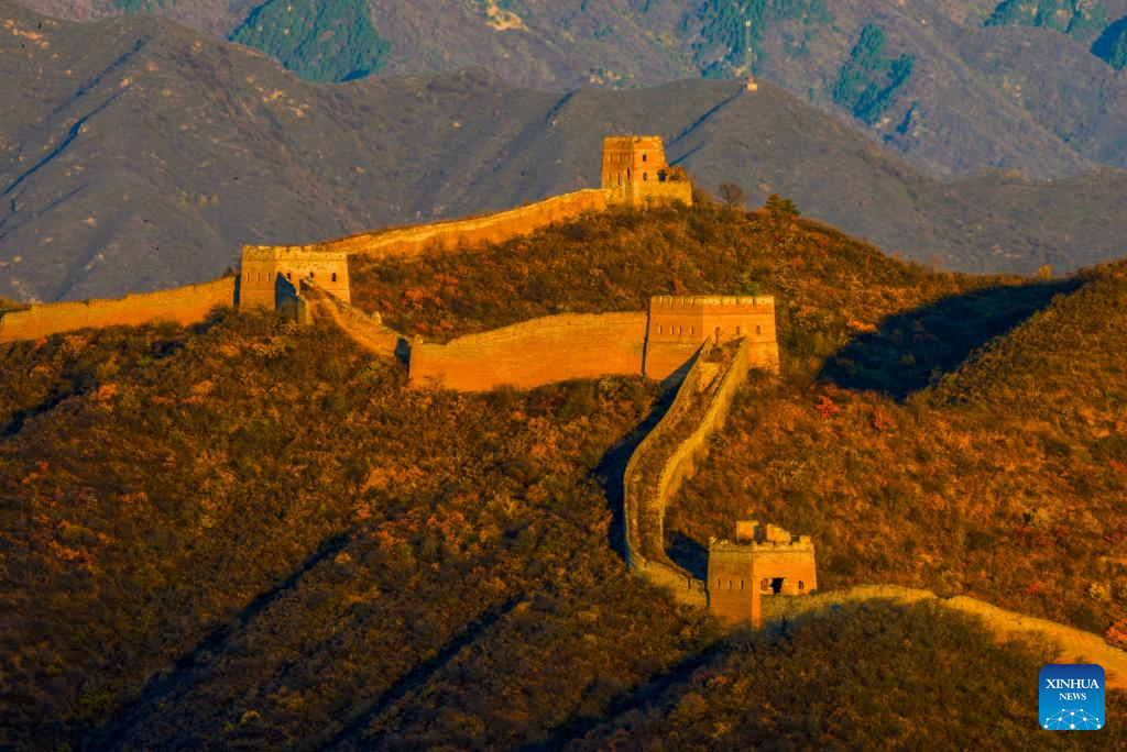 This aerial photo taken on Oct. 17, 2023 shows the autumn scenery at the Jinshanling section of the Great Wall in Luanping County, north China's Hebei Province. With the change of the four seasons, the Jinshanling section of the Great Wall puts on different layers of colors and shows magnificent beauty. (Photo by Zhou Wanping/Xinhua)