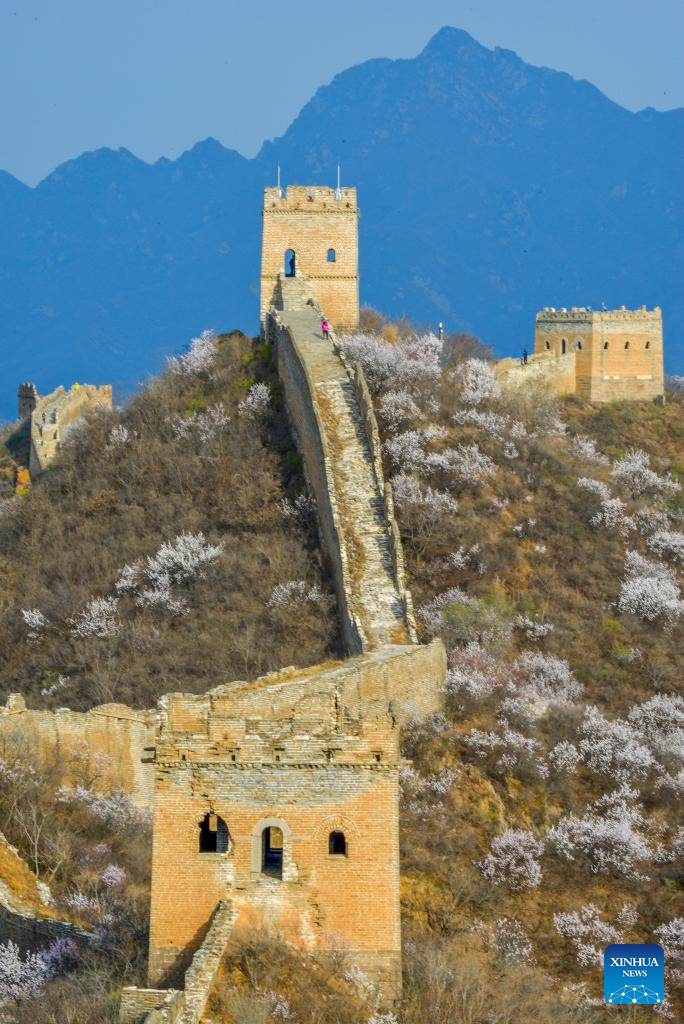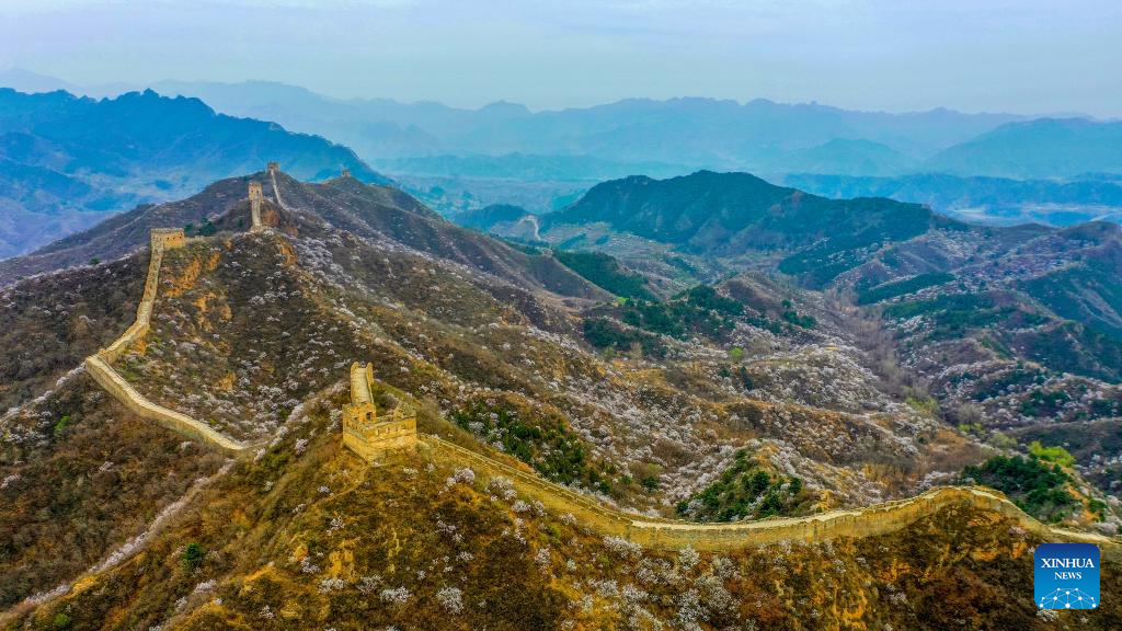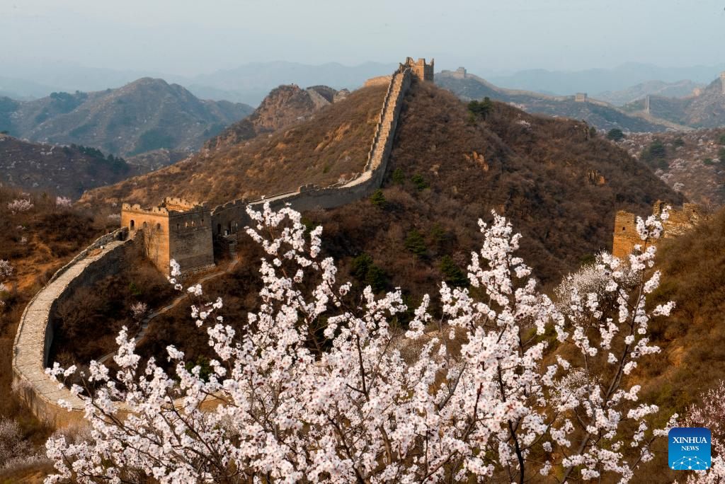 This aerial photo taken on April 1, 2023 shows the spring scenery at the Jinshanling section of the Great Wall in Luanping County, north China's Hebei Province. With the change of the four seasons, the Jinshanling section of the Great Wall puts on different layers of colors and shows magnificent beauty. (Photo by Zhou Wanping/Xinhua)