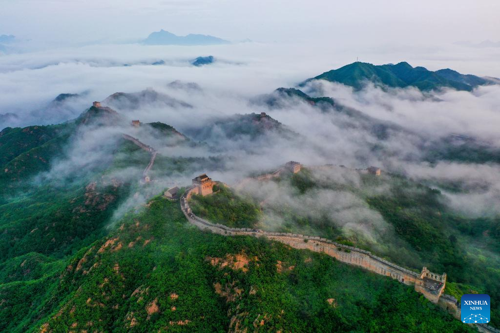 This aerial photo taken on July 23, 2023 shows the summer scenery at the Jinshanling section of the Great Wall in Luanping County, north China's Hebei Province. With the change of the four seasons, the Jinshanling section of the Great Wall puts on different layers of colors and shows magnificent beauty. (Photo by Zhou Wanping/Xinhua)