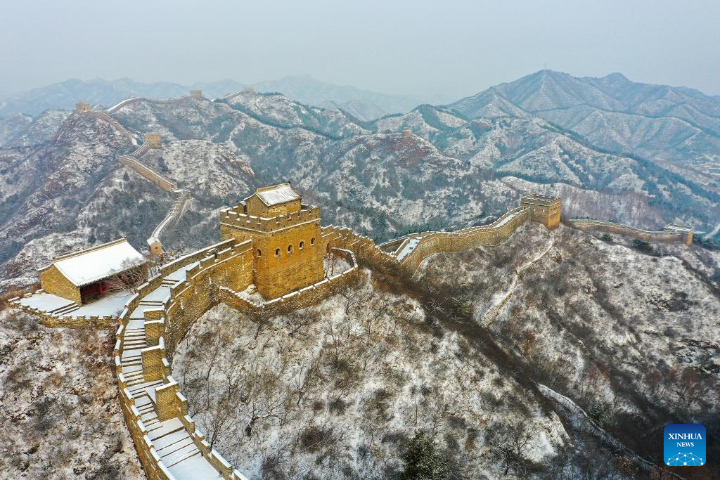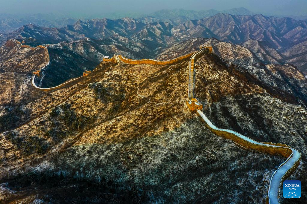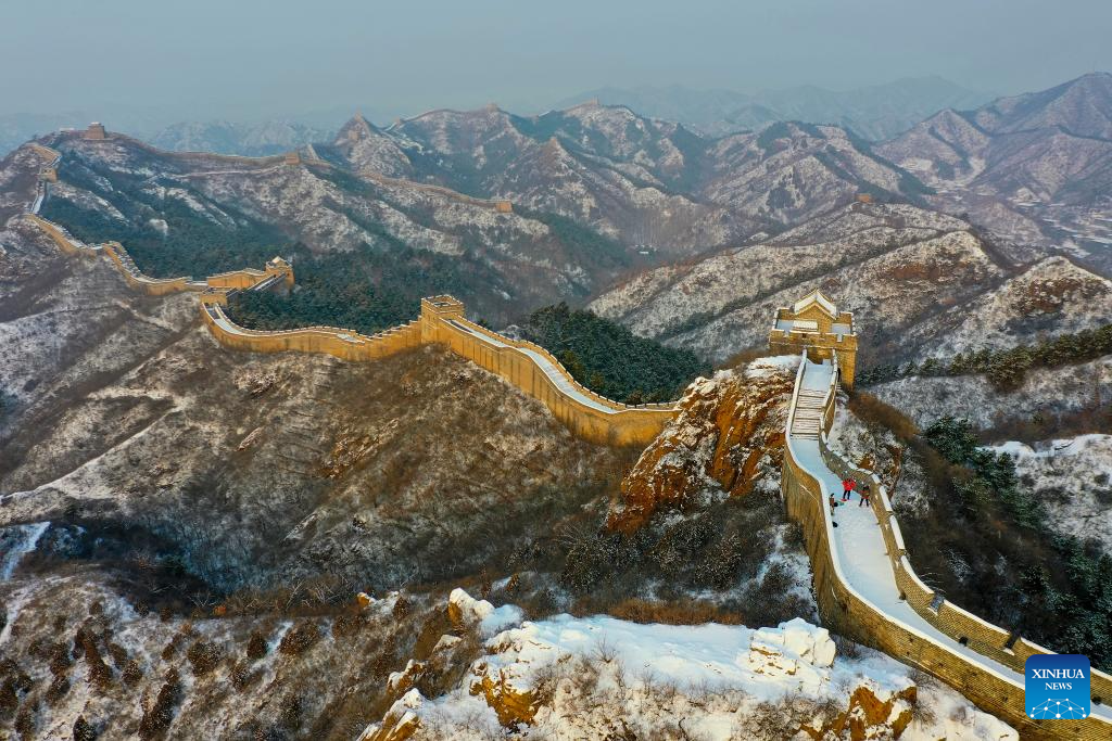 This aerial photo taken on Jan. 13, 2023 shows the winter scenery at the Jinshanling section of the Great Wall in Luanping County, north China's Hebei Province. With the change of the four seasons, the Jinshanling section of the Great Wall puts on different layers of colors and shows magnificent beauty. (Photo by Zhou Wanping/Xinhua)