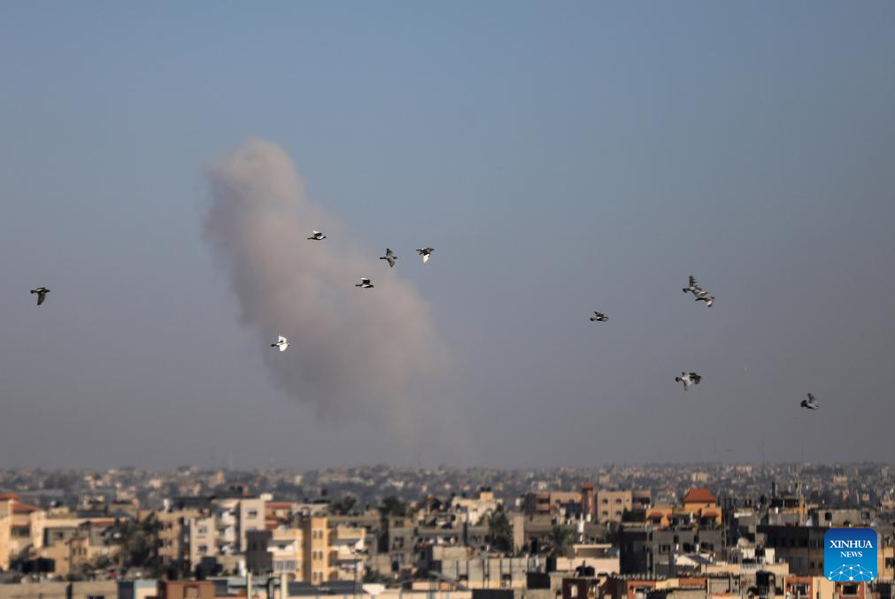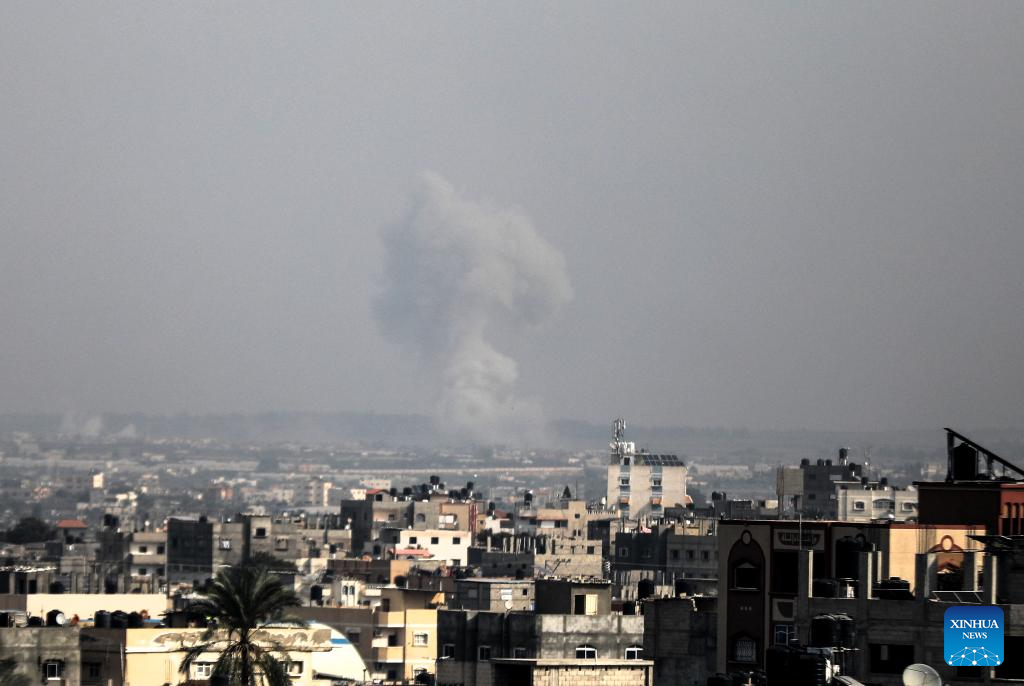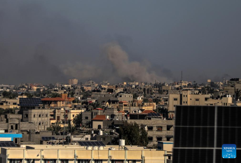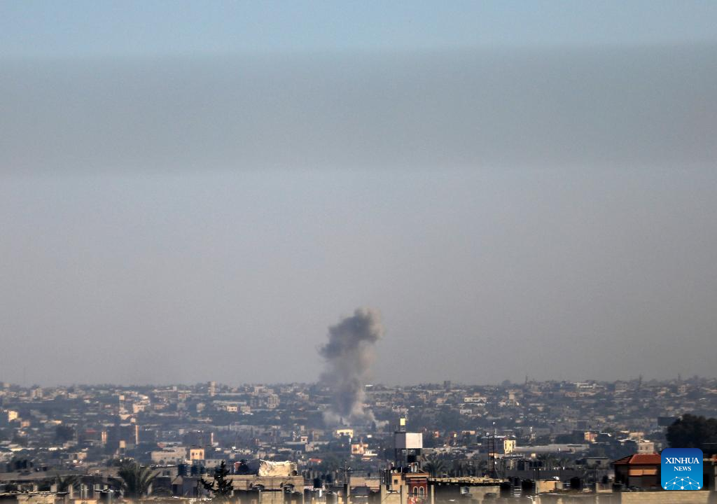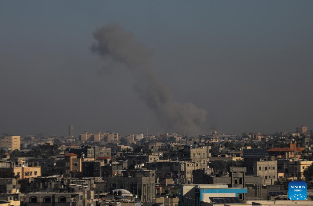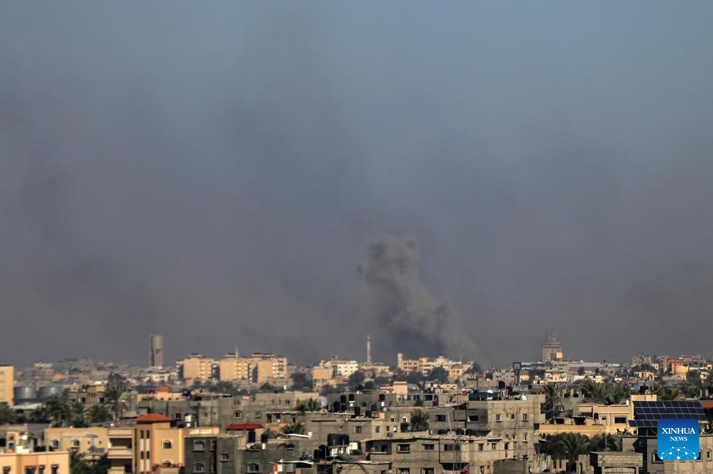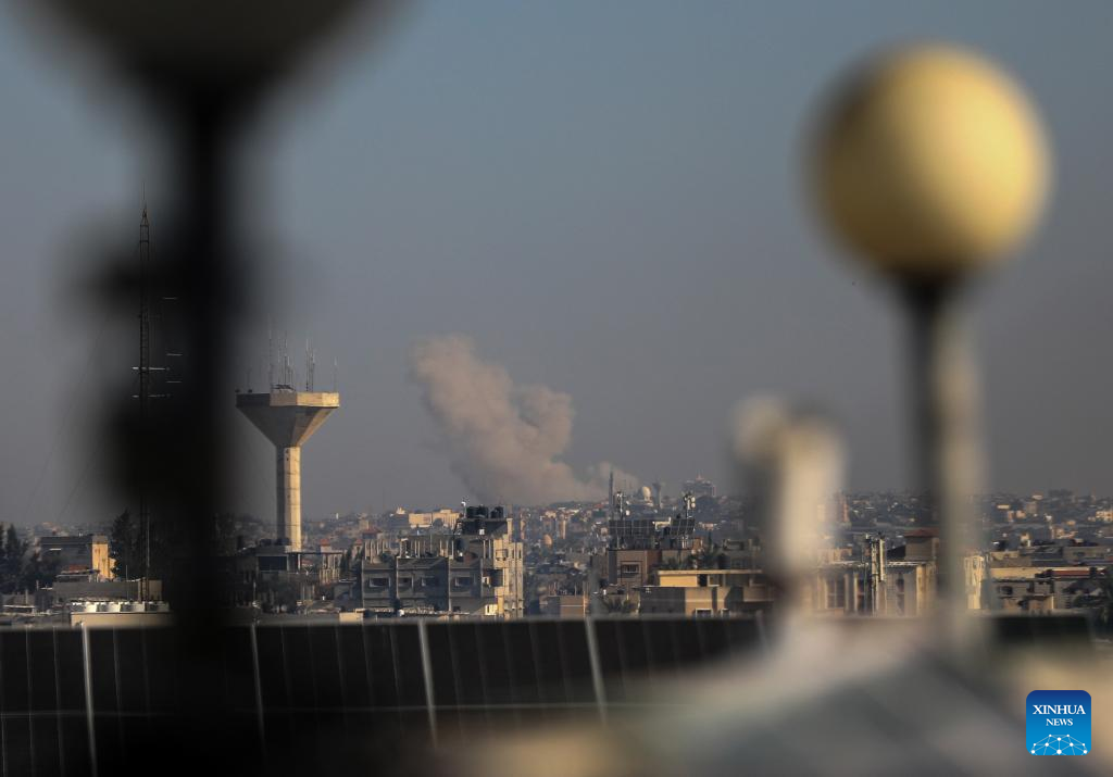 Smoke rises following an Israeli airstrike in the southern Gaza Strip city of Khan Younis, on Dec. 27, 2023. During the past 24 hours, 195 people were killed while 325 were injured and transported to hospitals due to Israeli attacks, said the Gaza Health Ministry. (Photo by Yasser Qudih/Xinhua)