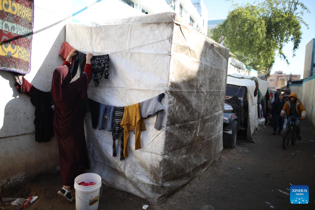 A temporary shelter is seen at Nuseirat Refugee Camp, central Gaza Strip, on Dec. 26, 2023. During the past 24 hours, 195 people were killed while 325 were injured and transported to hospitals in the Gaza Strip due to Israeli attacks, said the Gaza Health Ministry. (Xinhua)