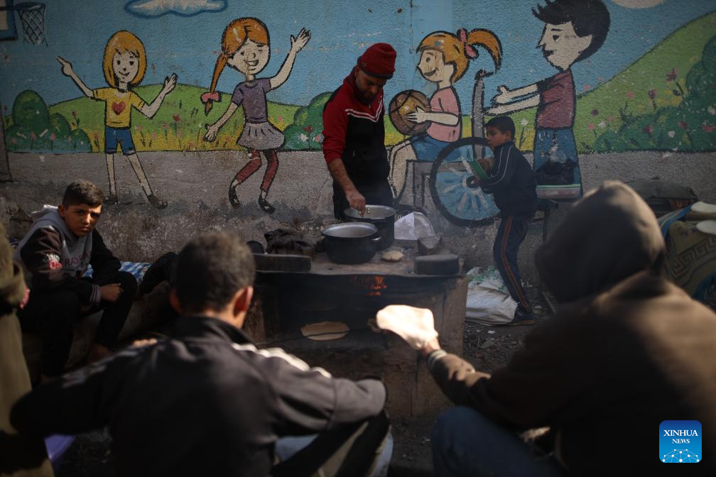 People cook food at Nuseirat Refugee Camp, central Gaza Strip, on Dec. 26, 2023. During the past 24 hours, 195 people were killed while 325 were injured and transported to hospitals in the Gaza Strip due to Israeli attacks, said the Gaza Health Ministry. (Xinhua)