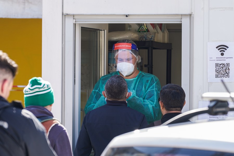 A health worker collects a swab from a man at a COVID-19 test station in Berlin, capital of Germany, on March 24, 2022. (Photo by Stefan Zeitz/Xinhua)