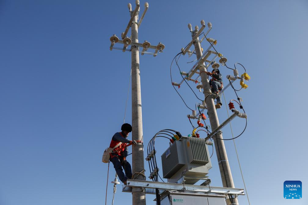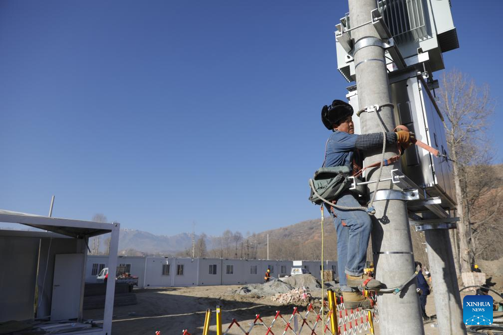 An employee of the State Grid works at a temporary settlement site in Chuimatan Town of Jishishan, northwest China's Gansu Province, Dec. 27, 2023. (Xinhua/Fang Xin)