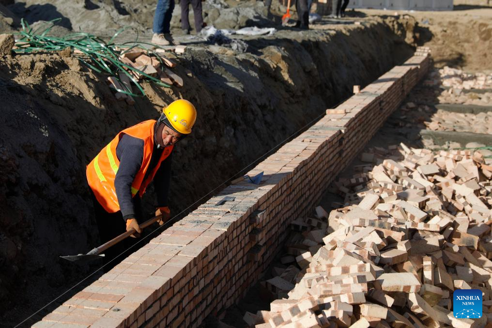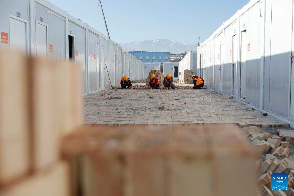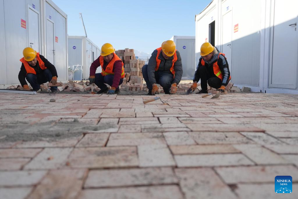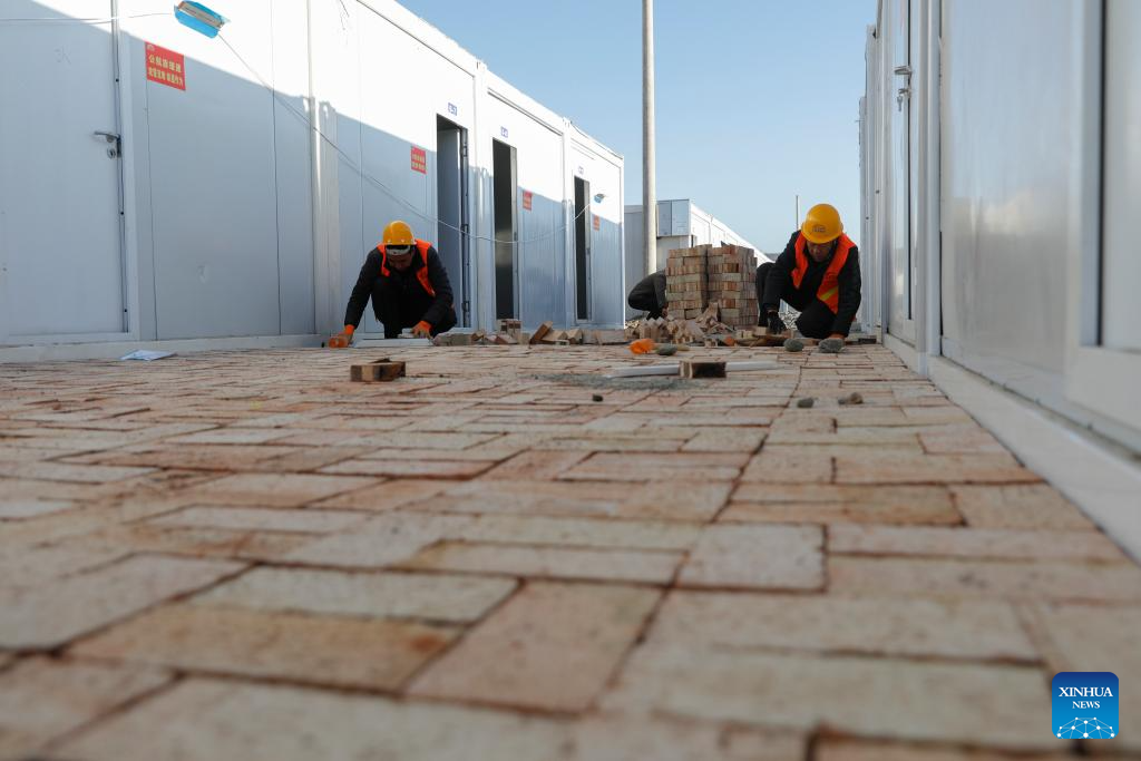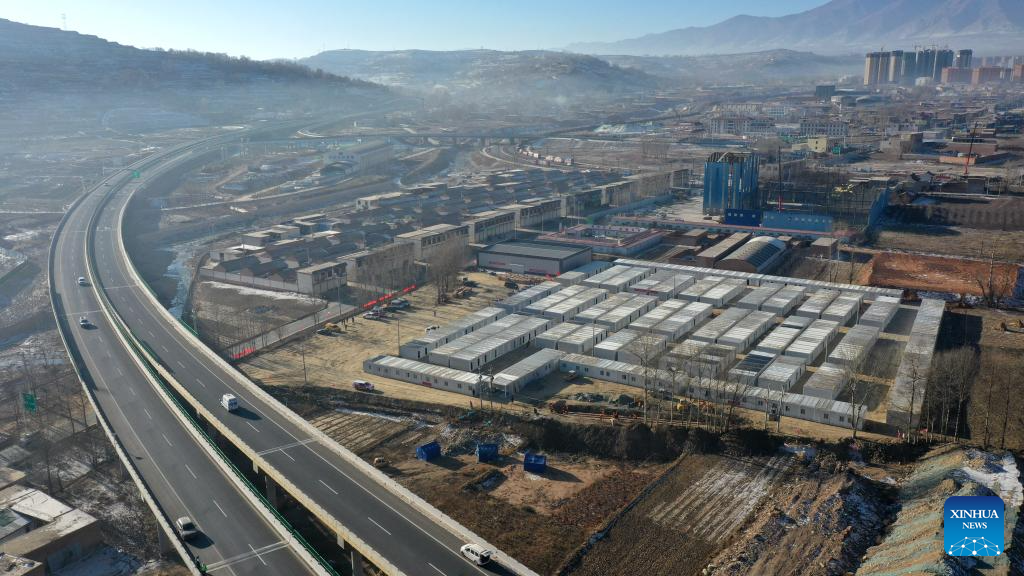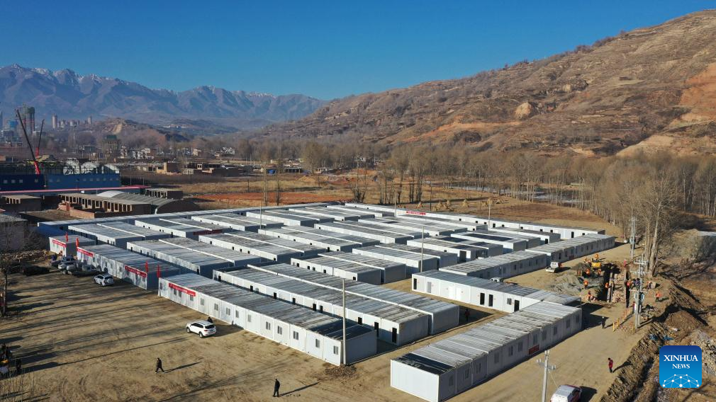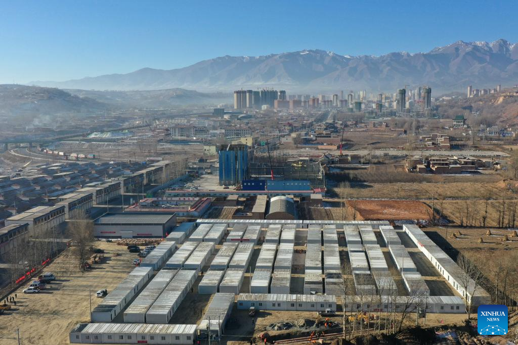 Construction workers work at a temporary settlement site in Chuimatan Town of Jishishan, northwest China's Gansu Province, Dec. 27, 2023. (Xinhua/Fang Xin)