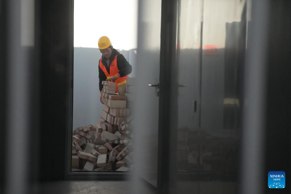 A construction worker works at a temporary settlement site in Chuimatan Town of Jishishan, northwest China's Gansu Province, Dec. 27, 2023. (Xinhua/Fang Xin)