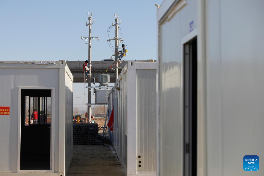 Employees of the State Grid work at a temporary settlement site in Chuimatan Town of Jishishan, northwest China's Gansu Province, Dec. 27, 2023. (Xinhua/Fang Xin)