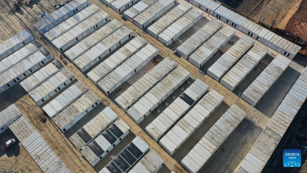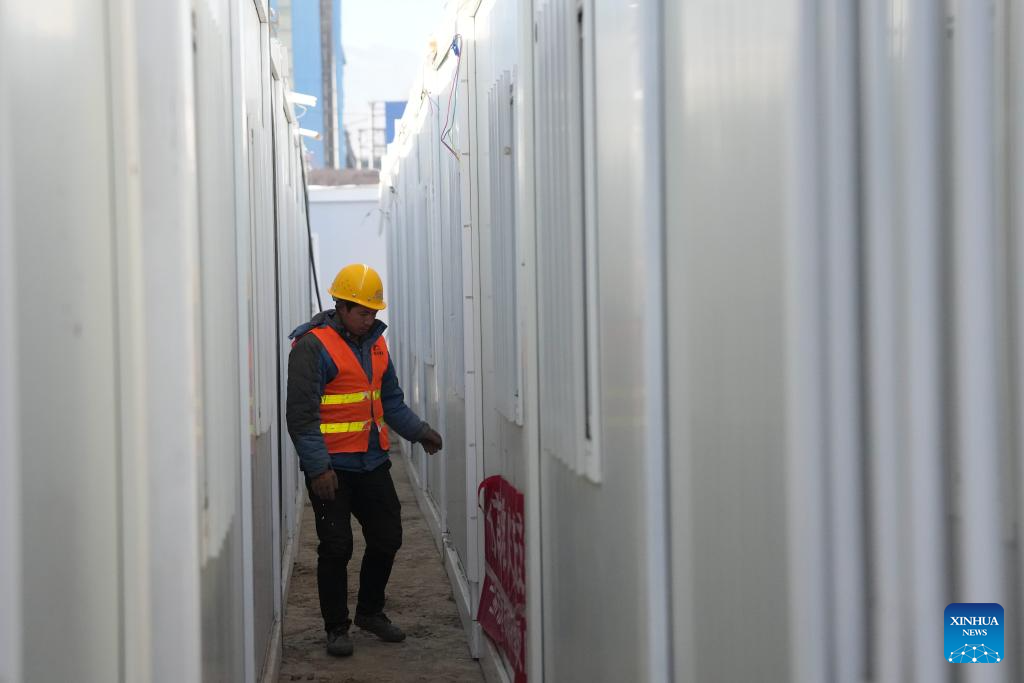 A construction worker checks the condition of prefab houses at a temporary settlement site in Chuimatan Town of Jishishan, northwest China's Gansu Province, Dec. 27, 2023. (Xinhua/Chen Bin)