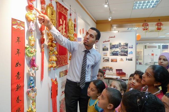 Abbas El-Said explains the 12 Chinese zodiac animals to local students at the China Cultural Center in Cairo, Egypt. This photo appeared on page 19 of the June 8, 2012 edition of People's Daily. (People's Daily/Wen Hongyan)