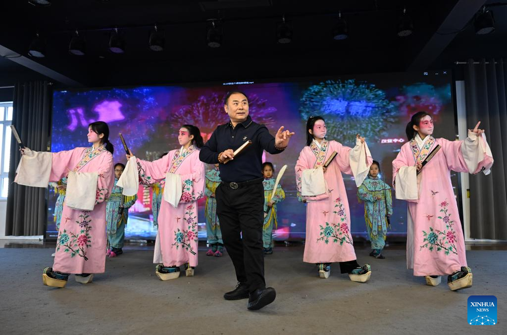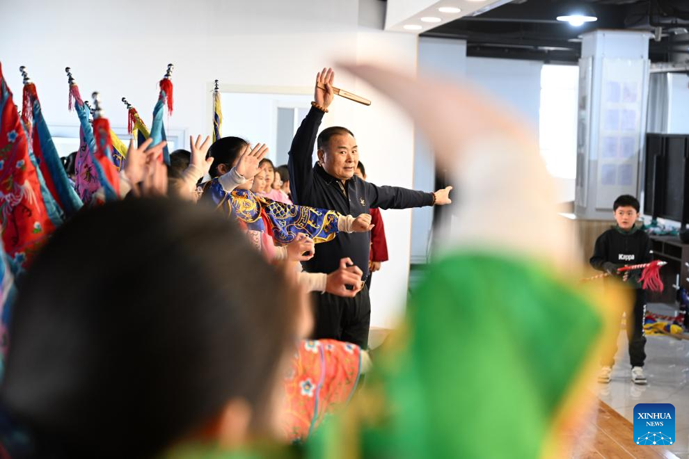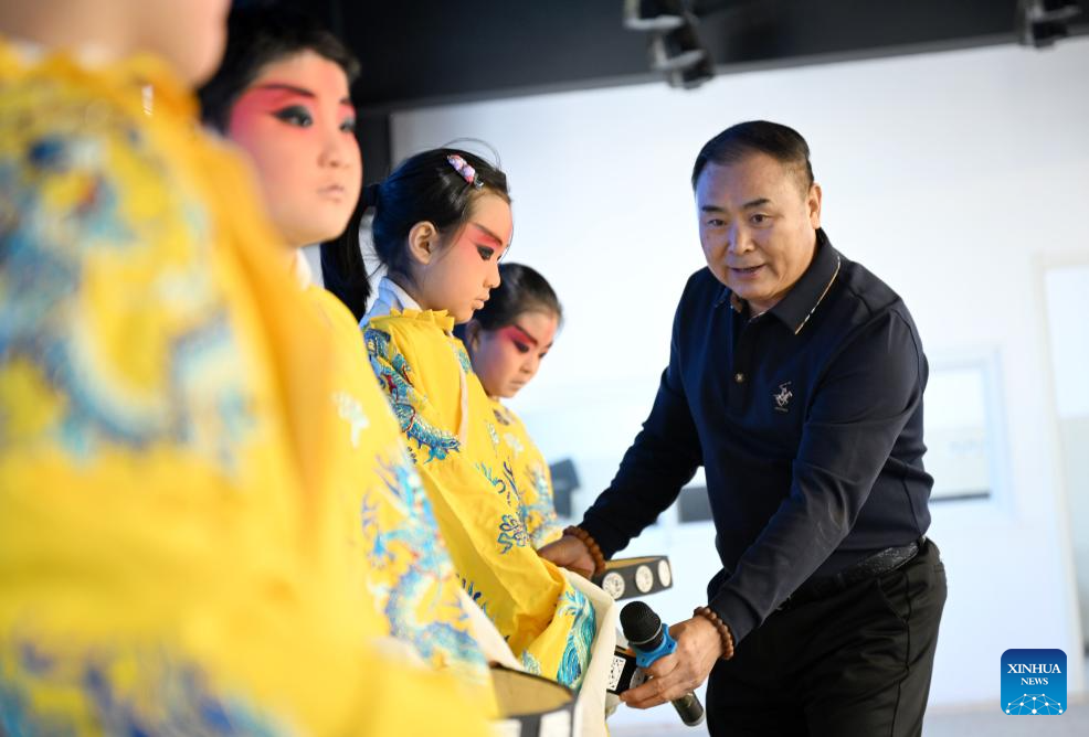 Provincial-level inheritor of traditional Baoding Laodiao opera Du Zhenzhong teaches students at a school in Baoding, north China's Hebei Province, Dec. 27, 2023. In recent years, activities related to operas were introduced to the campus life in Lianchi district of Baoding City, offering local students opportunities to feel and inherit the traditional culture. (Xinhua/Jin Liangkuai)