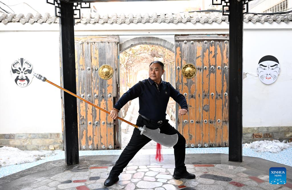 Provincial-level inheritor of traditional Baoding Laodiao opera Du Zhenzhong demonstrates at a school in Baoding, north China's Hebei Province, Dec. 27, 2023. In recent years, activities related to operas were introduced to the campus life in Lianchi district of Baoding City, offering local students opportunities to feel and inherit the traditional culture. (Xinhua/Jin Liangkuai)