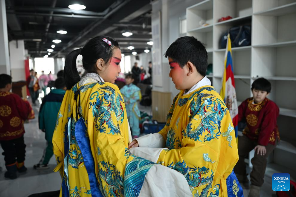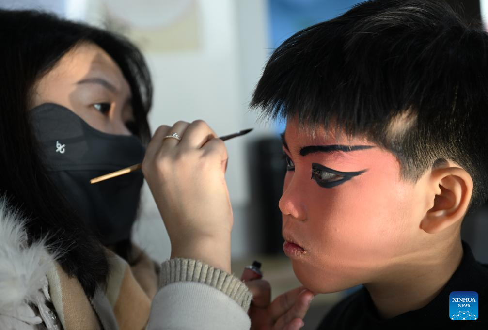 Students prepare for an opera performance at a school in Baoding, north China's Hebei Province, Dec. 27, 2023. In recent years, activities related to operas were introduced to the campus life in Lianchi district of Baoding City, offering local students opportunities to feel and inherit the traditional culture. (Xinhua/Jin Liangkuai)