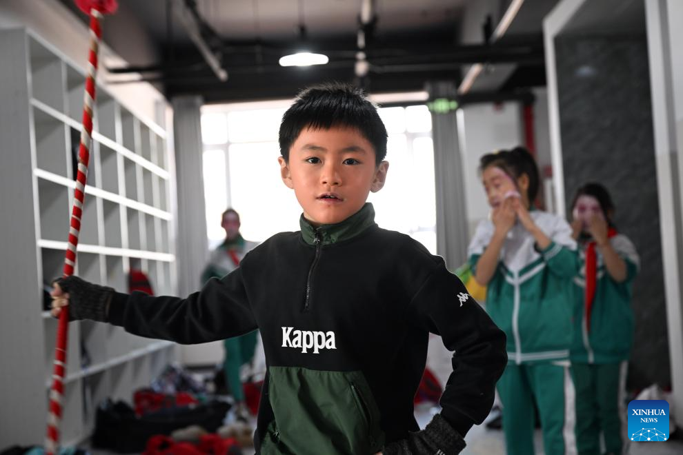 Students take part in a training for operas at a school in Baoding, north China's Hebei Province, Dec. 27, 2023. In recent years, activities related to operas were introduced to the campus life in Lianchi district of Baoding City, offering local students opportunities to feel and inherit the traditional culture. (Xinhua/Jin Liangkuai)