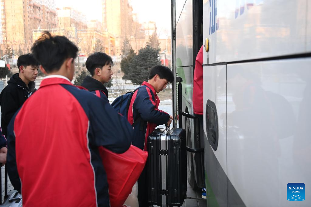 Grade three students are seen on a bus at the Jishi High School in Jishishan County, northwest China's Gansu Province, Dec. 28, 2023. (Xinhua/Fan Peishen)