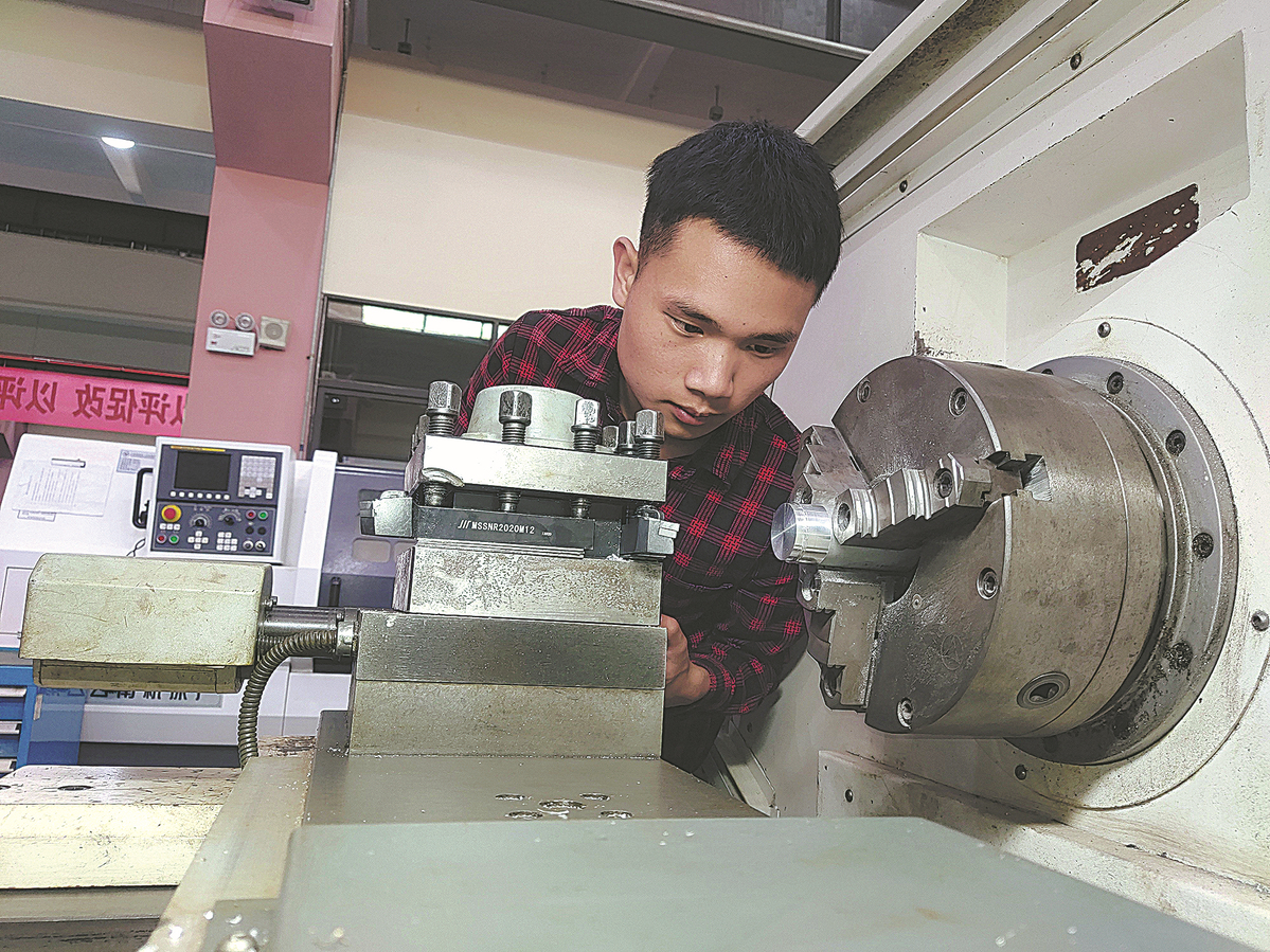 This file photo shows a worker working at the practical skills training center at a vocational school in China. [Photo/CHINA DAILY]