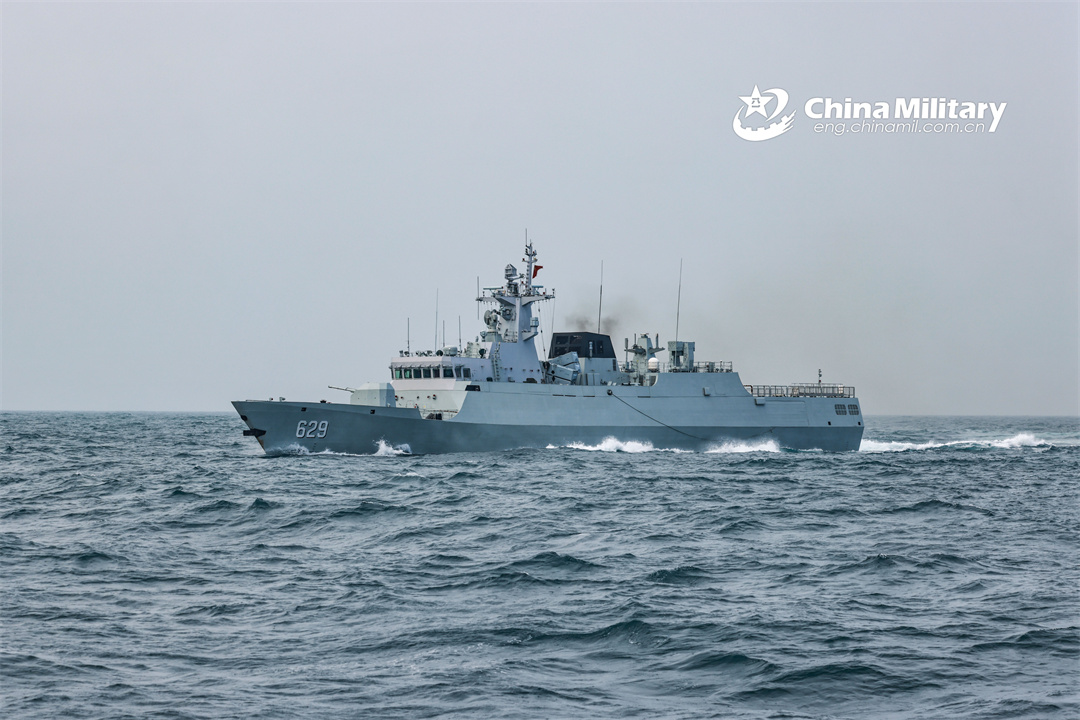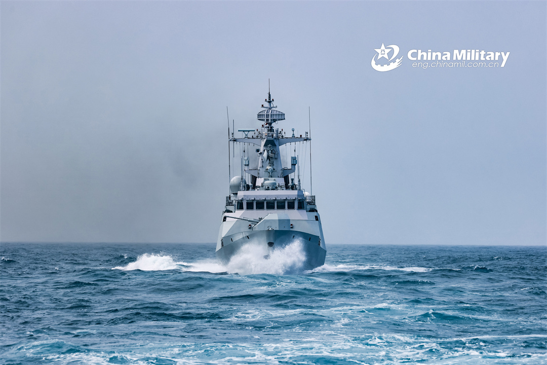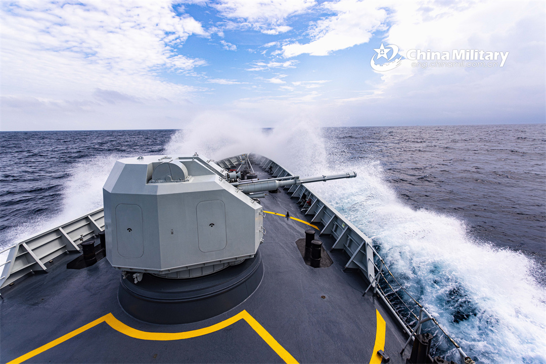 A guided-missile frigate attached to a destroyer flotilla with the navy under the PLA Southern Theater Command steams forward during a training exercise in recent days. (eng.chinamil.com.cn/Photo by Zhang Bin)