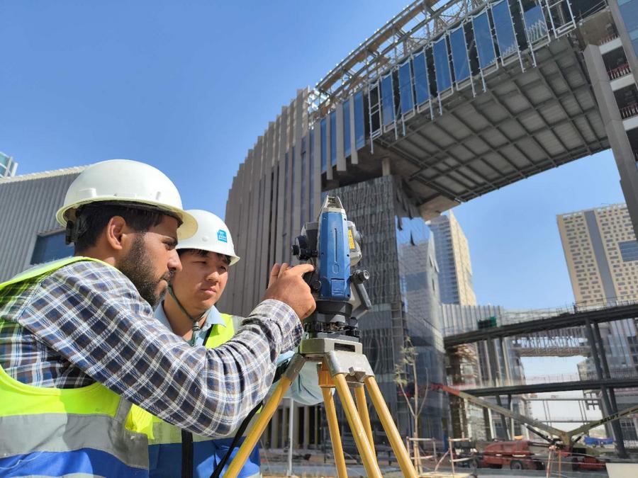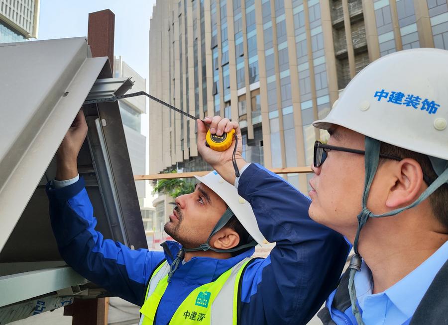 Chinese and Egyptian workers carry out measuring work together at the Central Business District (CBD) of Egypt's new administrative capital, 45 kilometers east of Cairo, Egypt, Sept. 24, 2023. (China Construction Shenzhen Decoration company/Handout via Xinhua)