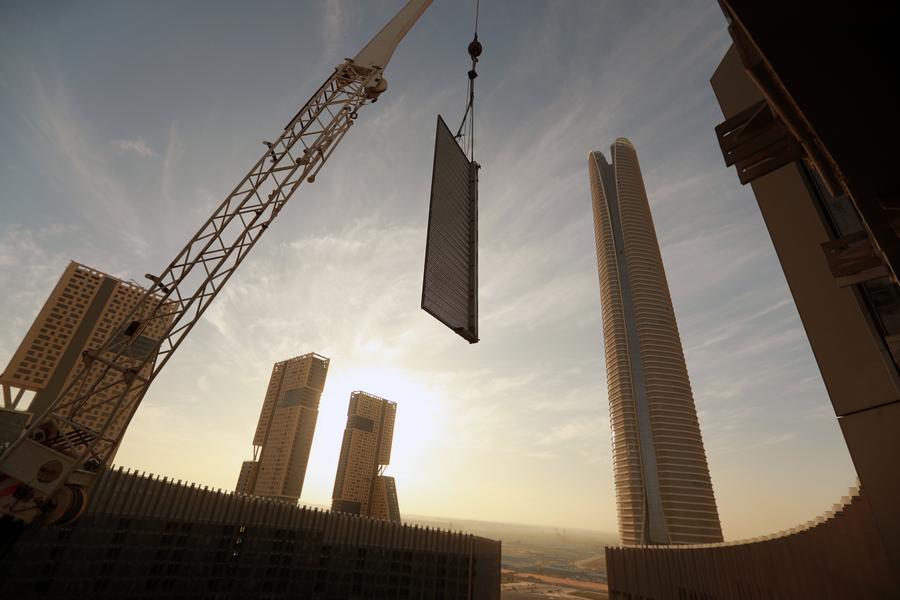 This photo taken on Nov. 22, 2023 shows the installation work of the curtain walls at the Central Business District (CBD) of Egypt's new administrative capital, 45 kilometers east of Cairo, Egypt. (Xinhua/Sui Xiankai)