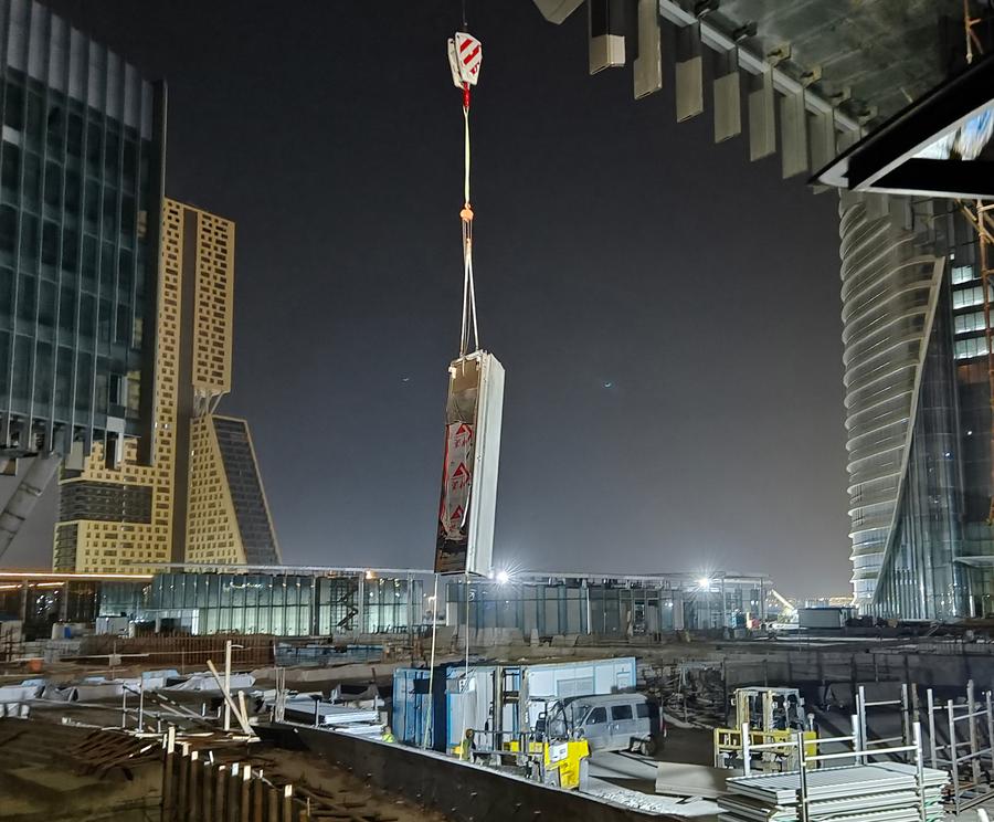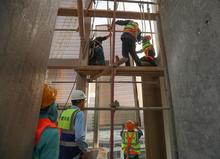 This cellphone photo taken on June 4, 2023 shows workers carrying out hoisting work of the curtain walls at the Central Business District (CBD) of Egypt's new administrative capital, 45 kilometers east of Cairo, Egypt. (China Construction Shenzhen Decoration company/Handout via Xinhua)