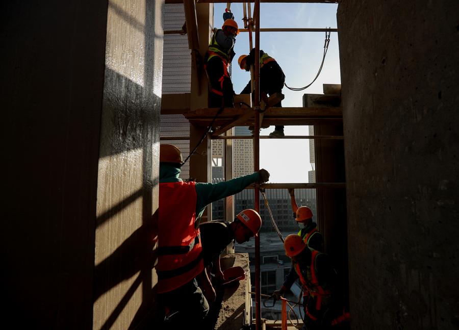 Workers install the curtain wall at the Central Business District (CBD) of Egypt's new administrative capital, 45 kilometers east of Cairo, Egypt, Nov. 22, 2023. (Xinhua/Sui Xiankai)