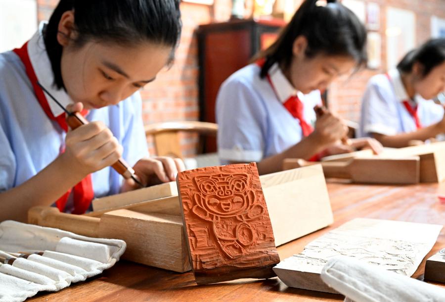 Students make Chinese woodblock printings of the mascot images of the Hangzhou Asian Games at a primary school in Hangzhou, east China's Zhejiang Province, Sept. 28, 2023. (Xinhua/Li An)