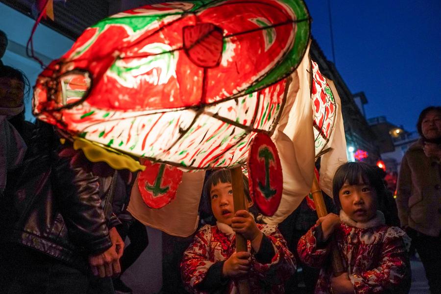 Children holding fish-shaped lanterns parade during the new year celebrations in Shexian County of Huangshan City, east China's Anhui Province, Jan. 31, 2023. (Xinhua/Du Yu)