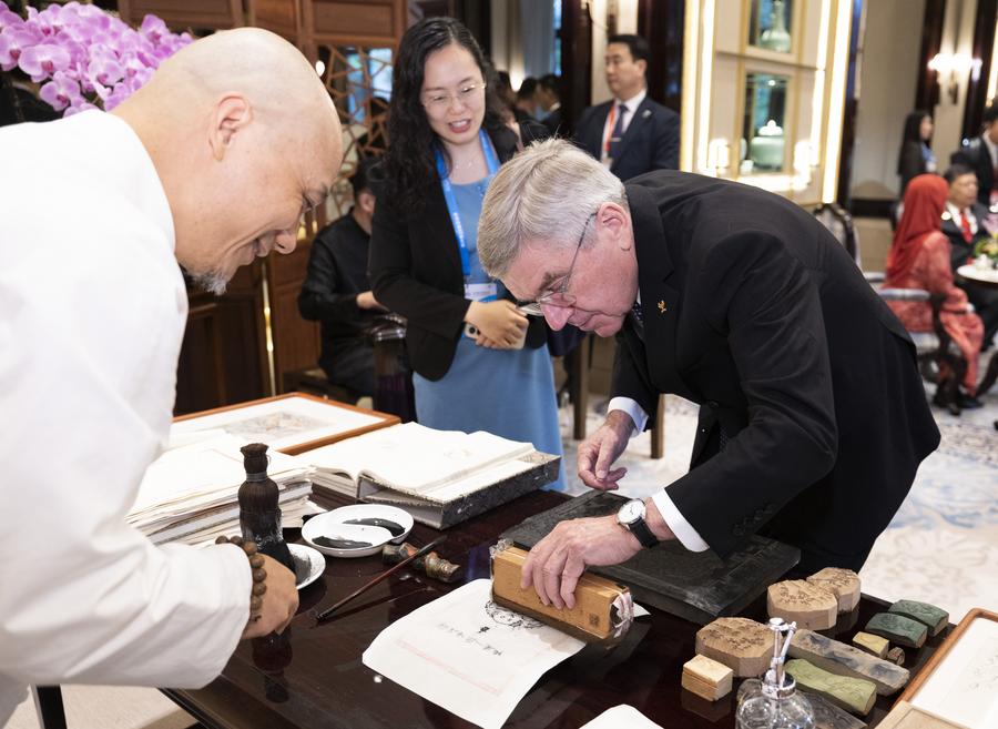 International Olympic Committee (IOC) President Thomas Bach participates in an activity demonstrating intangible cultural heritages before a welcoming banquet in Hangzhou, capital city of east China's Zhejiang Province, Sept. 23, 2023. (Xinhua/Huang Jingwen)