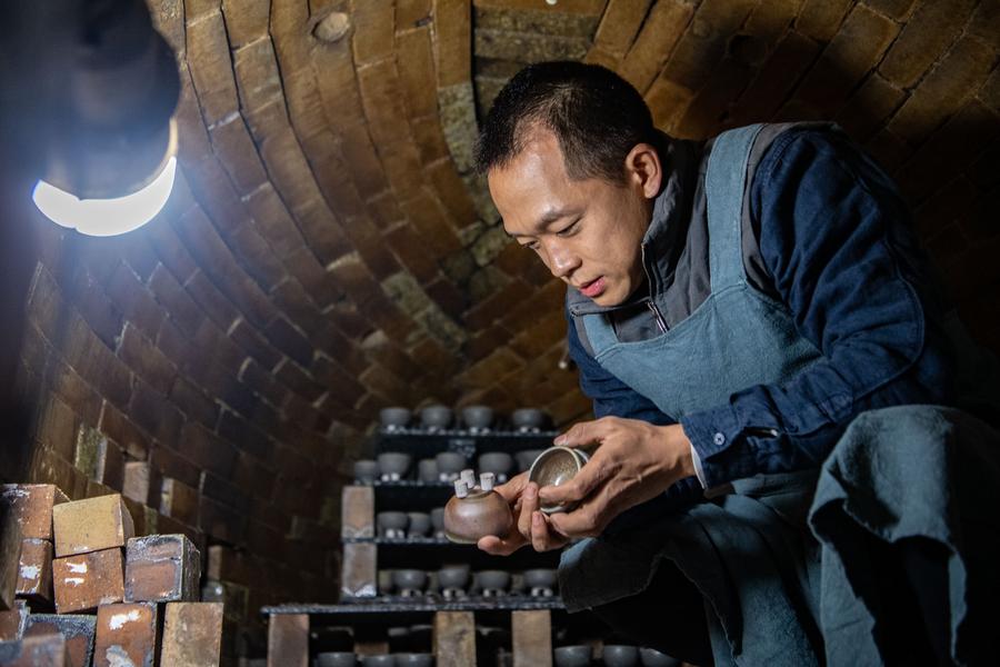 Guan Yongshuang, an inheritor of Rongchang Pottery craftsmanship, checks the firing of pottery inside a kiln in Chongqing, southwest China, Nov. 14, 2023.(Xinhua/Tang Yi)