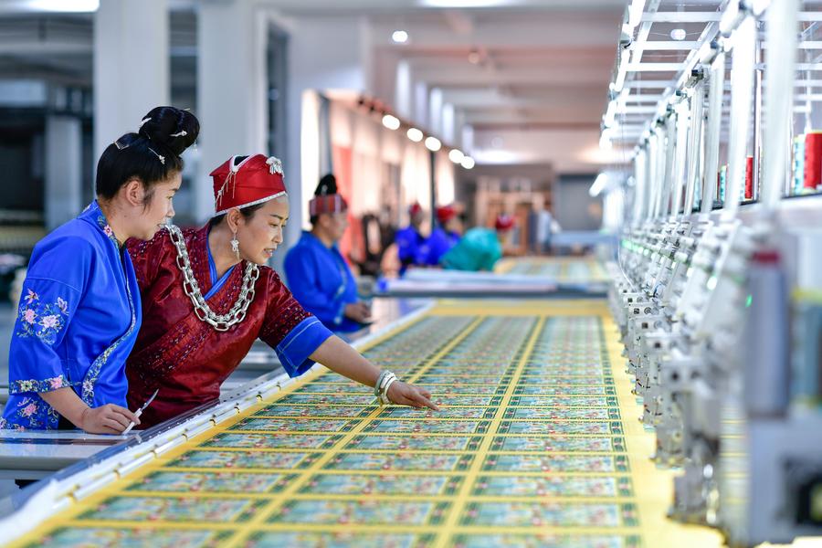 Long Luying (2nd L), a provincial-level inheritor of Miao embroidery, and her employee check Miao embroidery products at the workshop in Shibing County of Qiandongnan Miao and Dong Autonomous Prefecture, southwest China's Guizhou Province, Oct. 18, 2023. (Xinhua/Yang Wenbin)