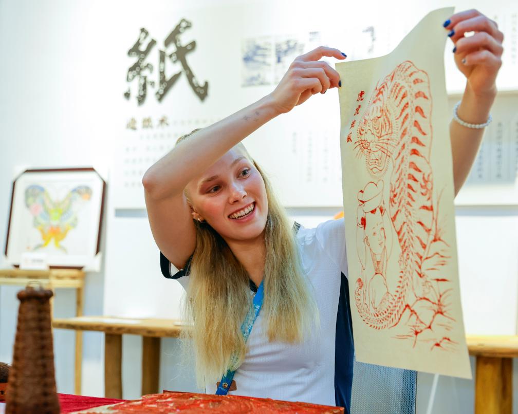 Jessica Ida Olivia Kahara of Finland presents the Jiajiang wooden pallet New Year Painting, which is an intangible cultural heritage in Jiajiang County at the Village of the 31st FISU Summer World University Games in Chengdu, southwest China's Sichuan Province, Aug. 3, 2023. (Xinhua/Shen Bohan)