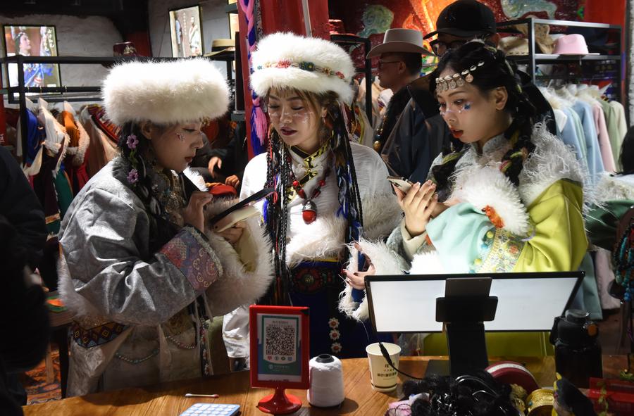 Tourists wearing traditional Tibetan costumes chat at a shop in Litang County, the Tibetan Autonomous Prefecture of Garze, southwest China's Sichuan Province, Oct. 10, 2023. (Xinhua/Huang Xiaoyong)
