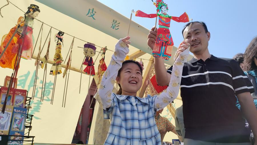 A child shows a shadow puppet during activities to celebrate China's Cultural and Natural Heritage Day in Kaifeng City, central China's Henan Province, June 10, 2023. (Photo by Li Junsheng/Xinhua)