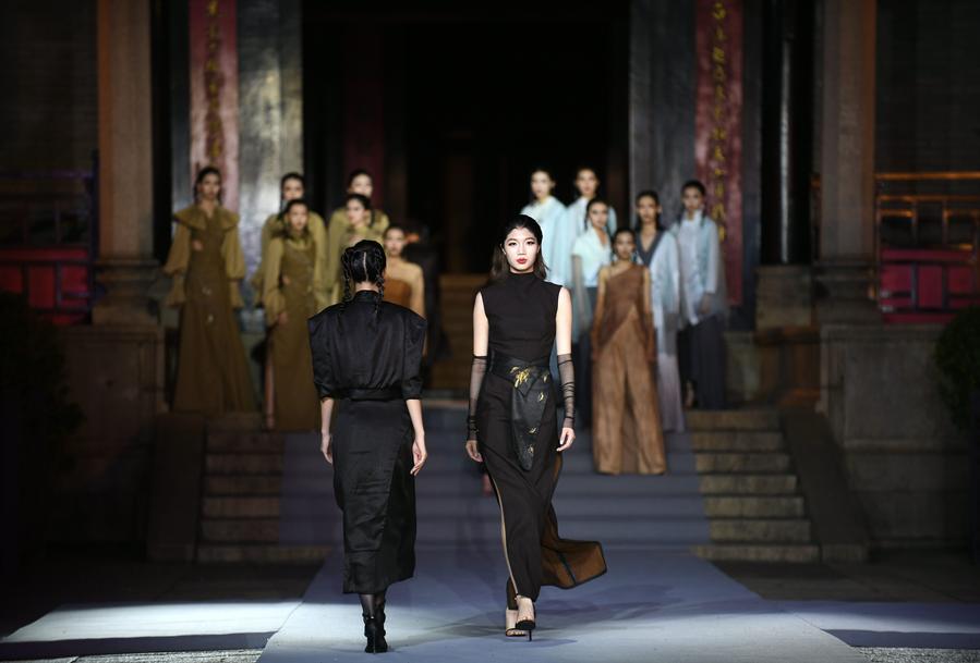 Models present fashion creations at a fashion show featuring elements from intangible cultural heritages at a temple in Guangzhou, south China's Guangdong Province, June 10, 2023. (Photo by Xu Jianmei/Xinhua)