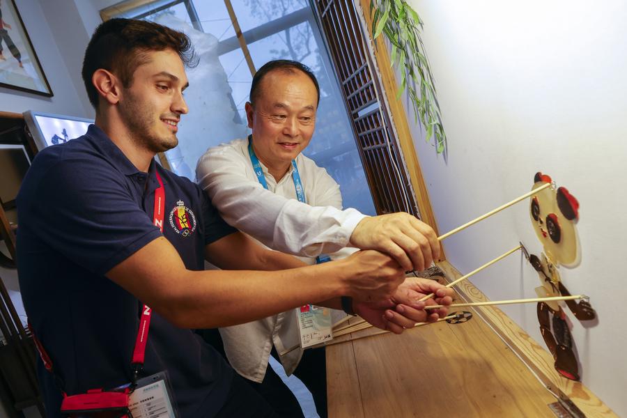 Members of different delegations experience traditional Chinese handicraft at the Asian Games Sub-village in Chun'an, east China's Zhejiang Province, Sept. 25, 2023. (Xinhua/Hu Huhu)