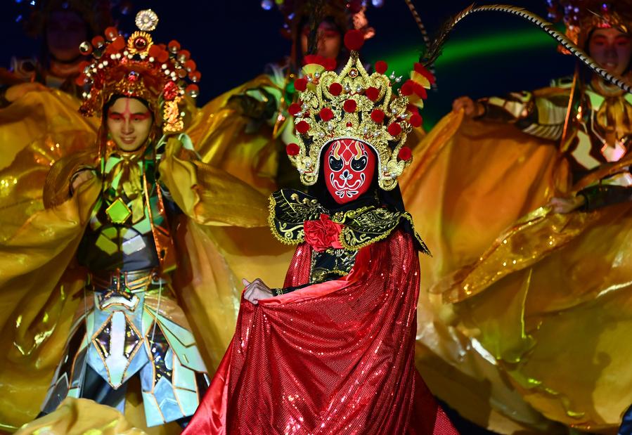 Actors and actresses perform the traditional "bian lian", or face-changing, during the opening ceremony of the 31st FISU Summer World University Games in Chengdu of southwest China's Sichuan Province, on July 28, 2023. (Xinhua/Chen Zeguo)