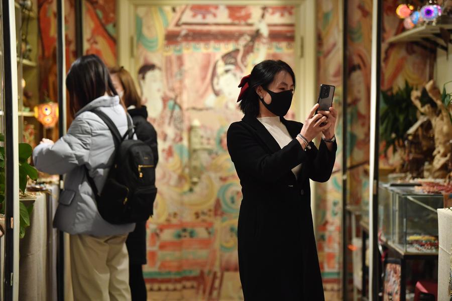 People visit a night market in Dunhuang, northwest China's Gansu Province, March 16, 2023. As a key pass along the ancient Silk Road, Dunhuang is home to the Mogao Grottoes, a UNESCO World Heritage Site that boasts a vast collection of Buddhist artworks -- more than 2,000 colored sculptures and 45,000 square meters of murals in 735 caves. (Xinhua/Chen Bin)