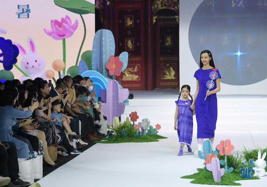 A girl and a woman present fashion creations during a family fashion show featuring elements from intangible cultural heritages at the China National Arts and Crafts Museum, also known as the China Intangible Cultural Heritage Museum, in Beijing, capital of China, May 21, 2023. (Xinhua/Li He)