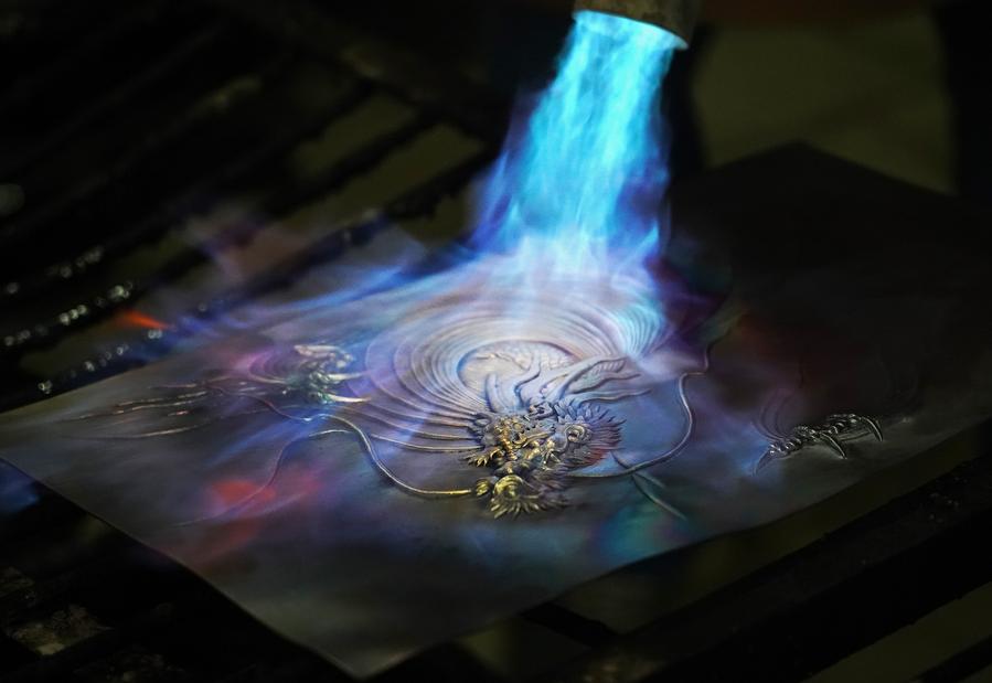 Huang Junjun, a representative inheritor of Guixi copper engraving, quenches a copper engraving artwork at a workshop of his company in Guixi City, east China's Jiangxi Province, July 13, 2023. (Xinhua/Wan Xiang)