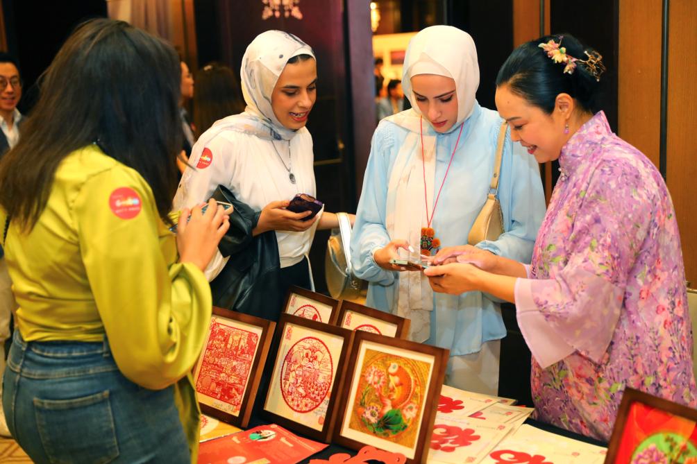 People learn about papercutting during a promotion event for south China's Guangdong Province in Cairo, Egypt, Nov. 19, 2023. (Xinhua/Sui Xiankai)