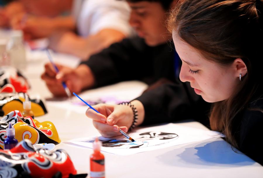 Students paint Chinese opera faces during an International Chinese Language Day event in London, Britain, May 11, 2023. (Xinhua/Li Ying)