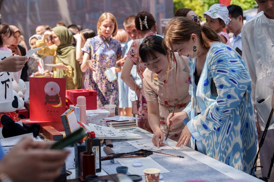 Visitors try Chinese calligraphy at a park in Tashkent, Uzbekistan, May 27, 2023. (Photo by Georgiy Namazov/Xinhua)