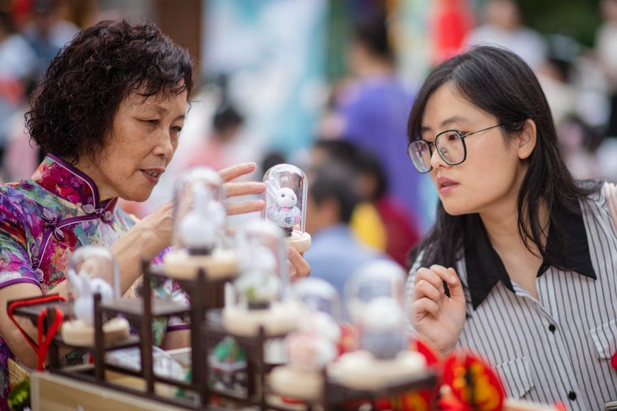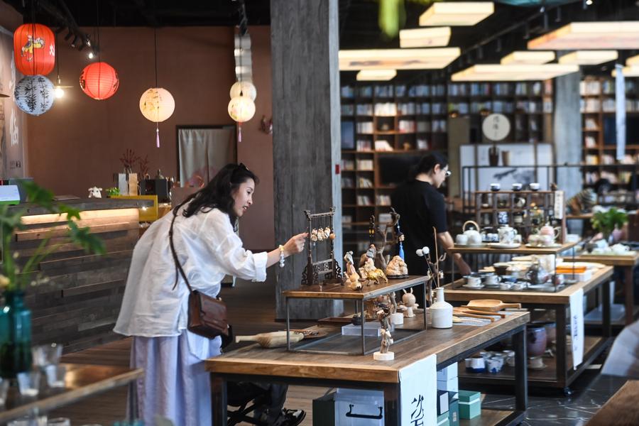 A customer shop for handicrafts at a folk art cultural center of a cultural park in Lin'an District of Hangzhou, capital of east China's Zhejiang Province, May 14, 2023. (Xinhua/Xu Yu)