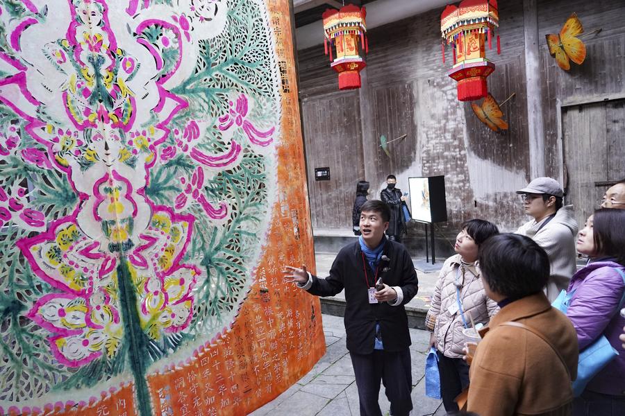 An artist (1st L) introduces a piece of artwork to people during an annual exhibition of Anhui paper crafts in Nanping Village of Yixian County, east China's Anhui Province, on Nov. 11, 2023. (Xinhua/Chen Zhonghao)
