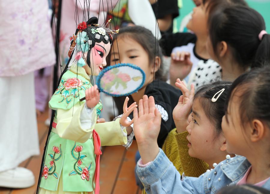 Children interact with puppets at a kindergarten in Qidu Town, Wujiang District of Suzhou City, east China's Jiangsu Province, April 20, 2023. In Qidu Town of Suzhou, there is a unique form of Kunqu Opera called "Kunqu Puppet" which features actors presenting performance with puppets on the stage. (Xinhua/Yang Lei)